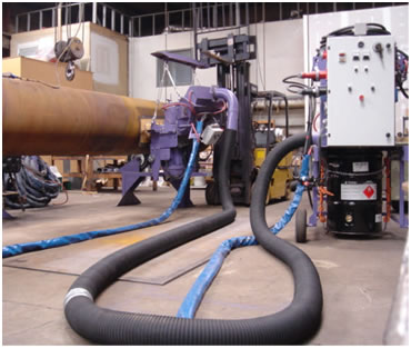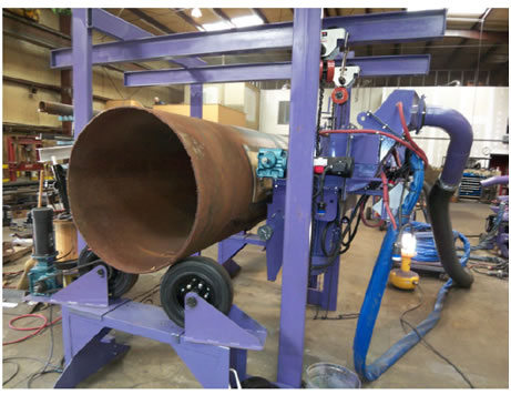 La máquina está suspendida de dos cascadas de cadenas, que están sujetas de carros que circulan en vigas tipo “l”. La máquina puede colocarse fácilmente por contacto adecuado con tubos de hasta 48 «de diámetro. |