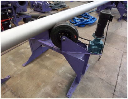 El soporte del transportador incluye dos ruedas motrices que pueden ser ajustadas para el tamaño de la tubería, la velocidad de rotación, y para el movimiento de avance deseado de la tubería. El motor con control de velocidad variable de corriente continua opera a partir de un panel de circuitos de 90 voltios ubicados en el panel de control principal. Se recomienda un mínimo de cuatro Soportes de Transporte. |