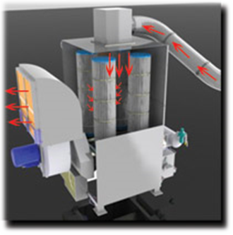 Posee elementos filtrantes (cartuchos) en poliéster no tejido, que se fijan y sellan individualmente en la placa separadora de las cámaras (limpia y sucia). Por debajo de los elementos filtrantes está dispuesta una tolva de captación de los residuos y en su parte inferior alberga una rosca de descarga de los residuos.