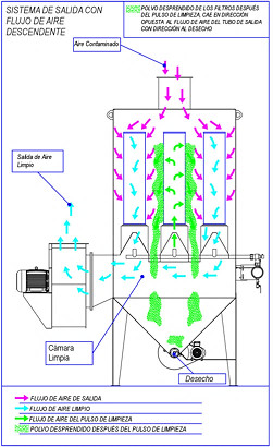 El colector de polvo tiene sistema de limpieza de los filtros tipo pulse-jet, el cual a través de contraflujo de aire preprogramado y regulado realiza la limpieza de los elementos filtrantes. El sistema se controla electrónicamente, donde se activan válvulas de diafragma con solenoides, que liberan un contraflujo de aire que pasa a través de venturis, ampliando el volumen de aire liberado por la válvula en aproximadamente tres veces. Este fuerte contraflujo de aire proporciona una eficiente limpieza de los medios filtrantes. El equipo dispone además de un manómetro de columna que indica la presión diferencial entre las cámaras.
