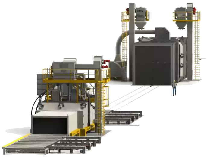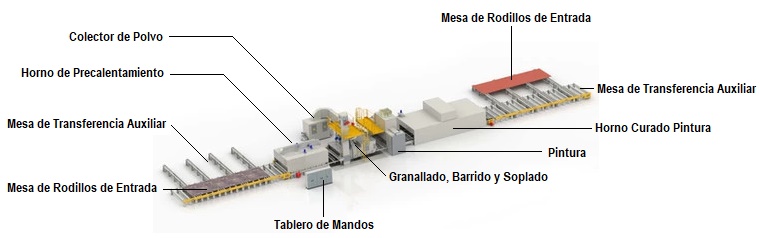 Línea de granallado y pintura para placas, perfiles y estructuras metálicas. Su alto rendimiento se debe a la disposición de las turbinas estratégicamente ubicadas en el interior de la cámara de trabajo. Dispone de un sistema de transporte completo desde la carga de pieza o estructura al inicio del proceso hasta la descarga de estas procesadas. Las piezas pasan por una cámara de precalentamiento, cabina de granallado automático, cabina de pintura automática y cámara de secado para entregar el producto totalmente terminado. Esta diseñado para procesar desde pequeñas hasta grandes cantidades con la mejor relación costo/beneficio. Diseñada y construida por CMV.