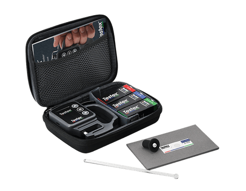 El kit de medidor de espesores con micrómetro digital Testex incluye todo lo necesario para medir el perfil de la superficie utilizando cinta de réplica. Incluye micrómetro digital, tres cartones de cinta de réplica – Gruesa, X-Gruesa y X-Gruesa Plus, dos herramientas de bruñido – Herramienta de bruñido de alta precisión y herramienta de bruñido clásica, manual de instrucciones, cable USB, certificado de calibración, una pila AAA y un estuche personalizado.