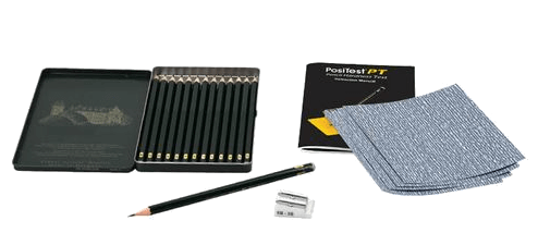 El PosiTest PT determina la dureza de la película mediante la prueba del lápiz (Wolff-Wilborn) de acuerdo con ISO 15184 y ASTM D3363.