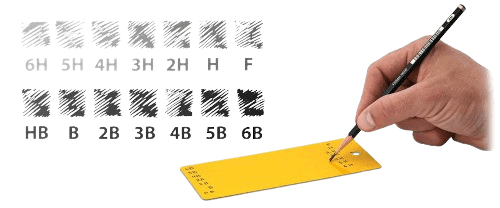 Al realizar una prueba de dureza de lápiz, los lápices tienen una escala de dureza que va de 6B (el más blando) a 6H (el más duro) y actúan como un indentador al ser empujados por la superficie a mano o con la ayuda de un carro.