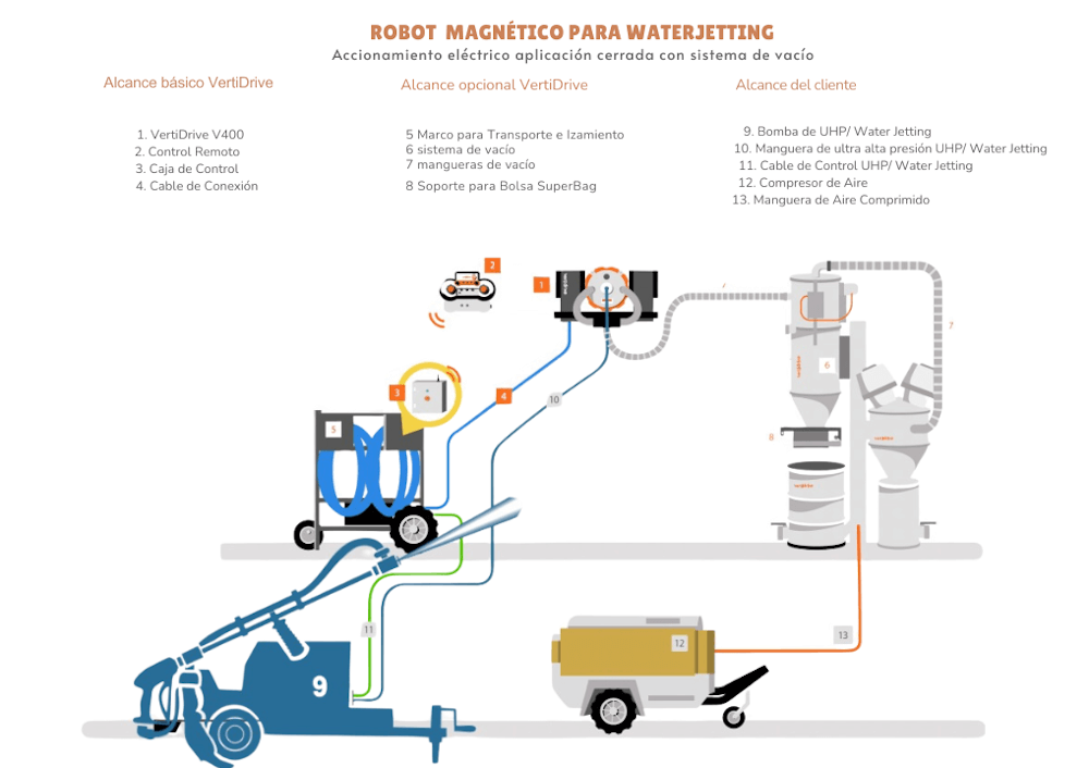 VertiDrive empresa innovadora líder mundial en el desarrollo de robots magnéticos con aplicaciones como waterjetting (chorro de agua, granallado UHP), granallado abrasivo (húmedo/seco) y más. Los robots se adhieren al acero por de accionamiento magnético y pueden moverse de forma independiente en todas las direcciones: arriba, ...