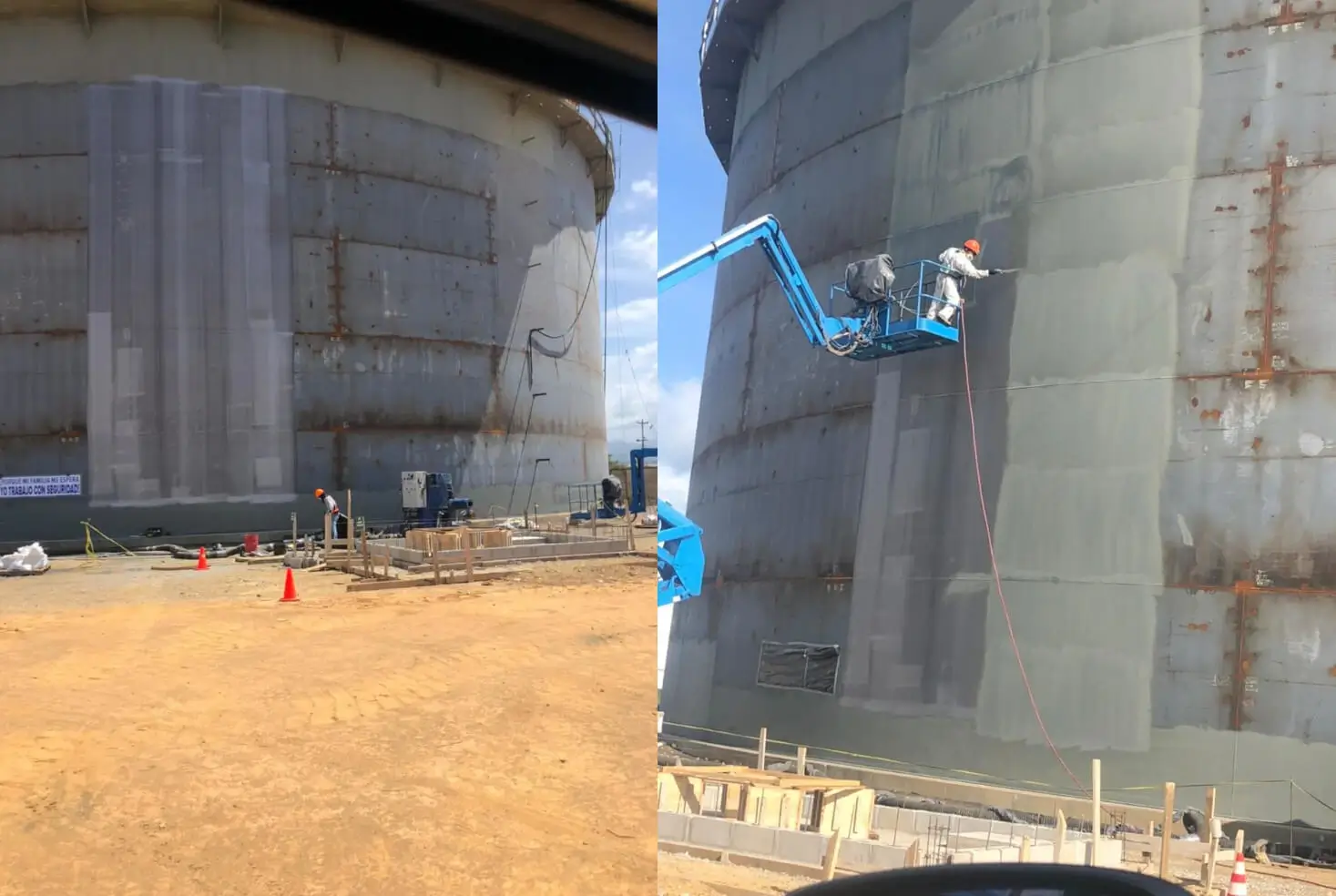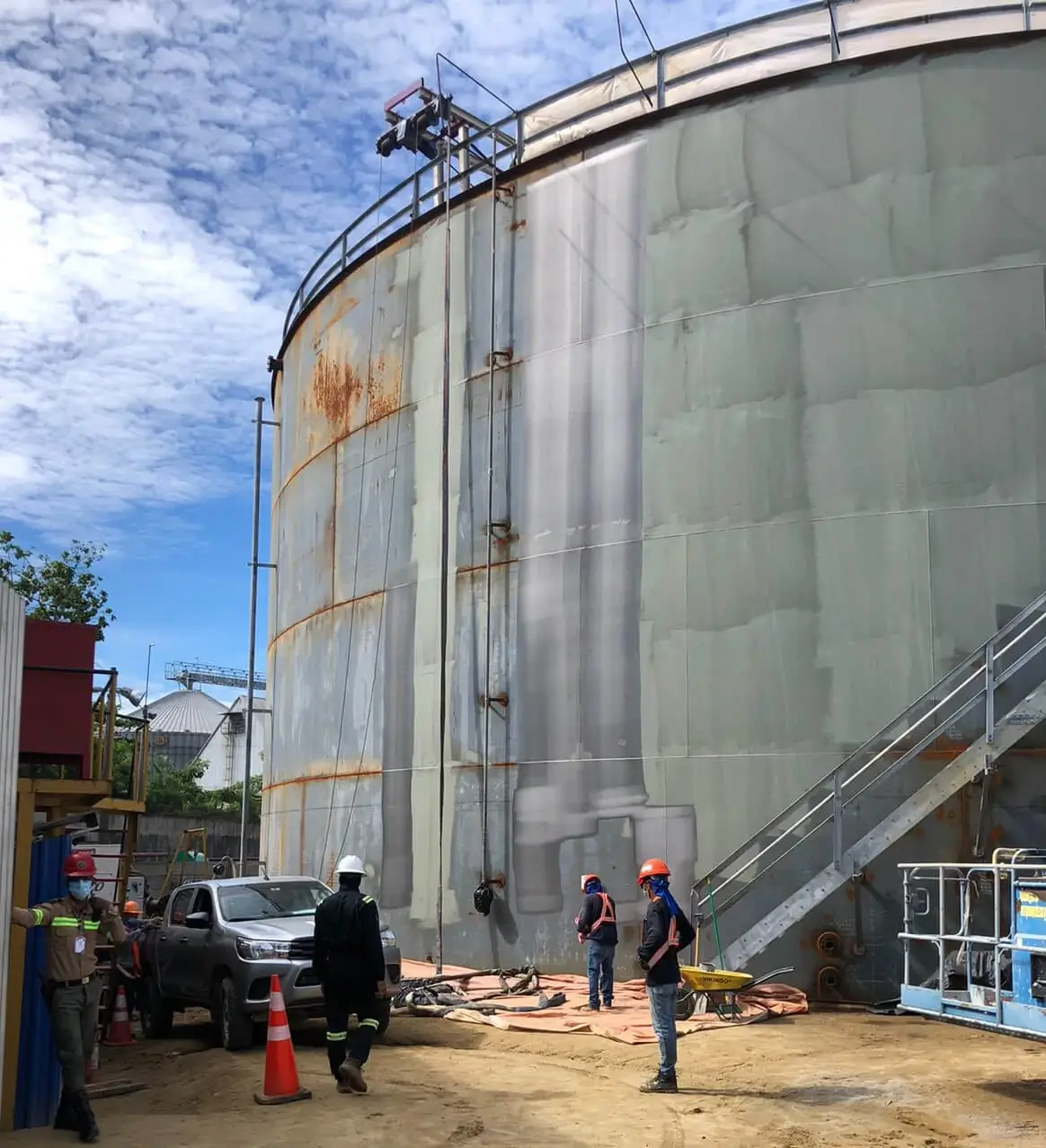 El proceso completo se realizó con especialistas Colombianos, entre los que destacamos, un Inspector NACE III, un Inspector NACE I, un experto en procesos de granallado manual, dos expertos en la tecnología FasterBlaster y un pintor profesional. También contamos con un grupo de trabajo local conformado por 10 operarios de granallado y pintura. Los resultados fueron excepcionales, gracias a las ventajas que ofrece el uso de la tecnología FasterBlaster, la efectividad y calidad del grupo de trabajo y el uso de las bombas airless 1:75 marca WIWA.